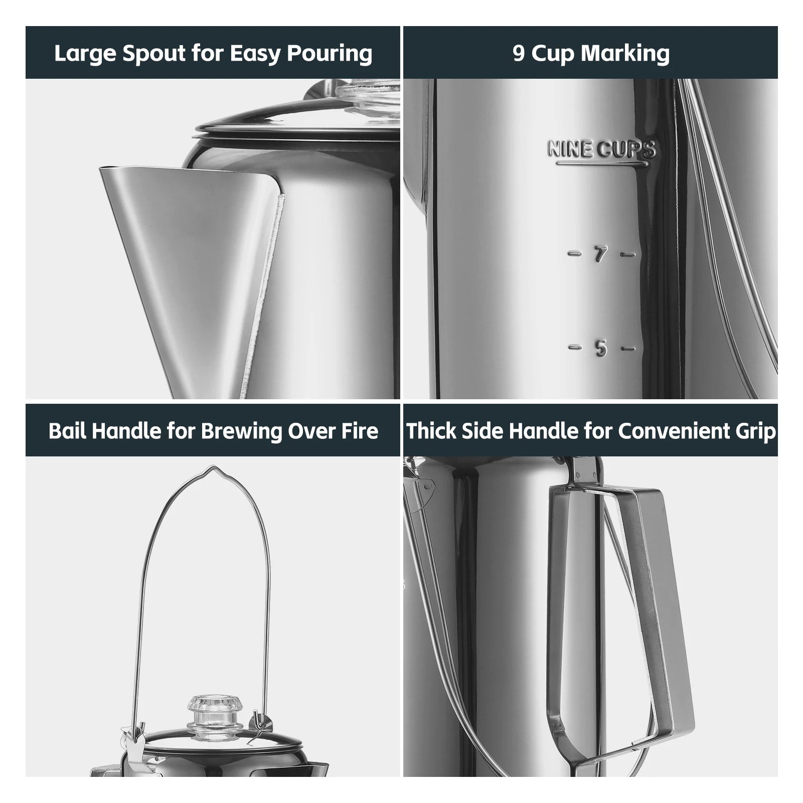 This 9-cup precolator coffee pot is corrosion-resistant and durable. It can be used on stove or over campfire, great for camping and weekend trip.