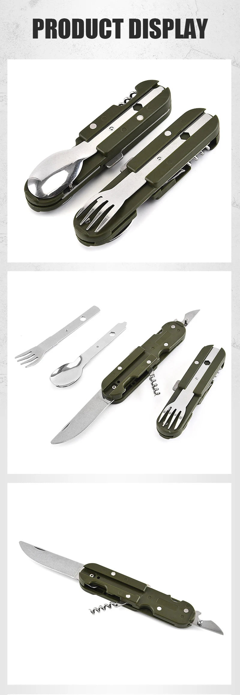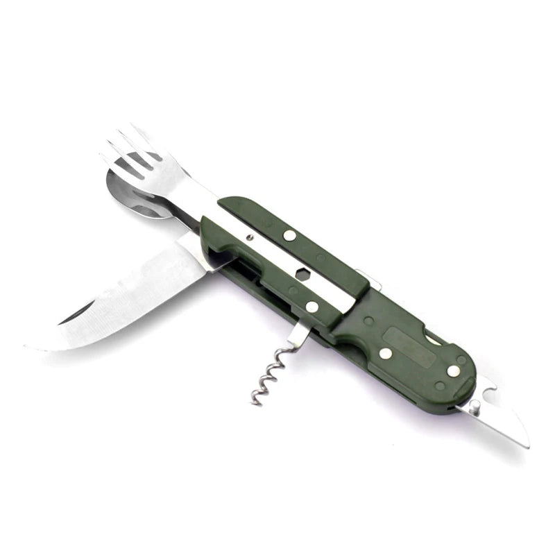 Camping Folding Picnic Cutlery Knife Portable Stainless Steel Army Green Fork Spoon Bottle Opener Flatware Tableware Travel Kit